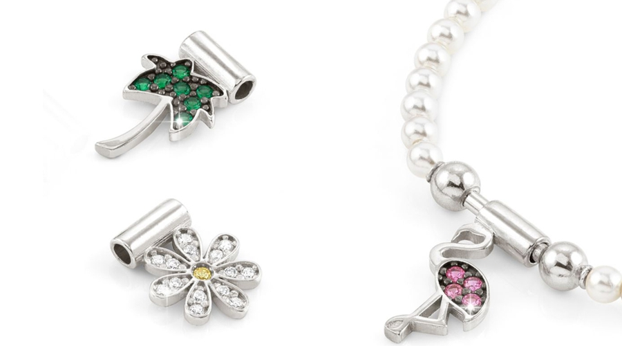 Nowe naszyjniki i bransoletki zdobione są kolorowymi kamieniami turmalinu lub perłami, a każdy z nich ma miejsce na dołożenie pojedynczej zawieszki. Nowe zawieszki, inspirowane latem, zawierają motywy tęczy, palmy, flaminga, jednorożca, stokrotki, gwiazdy, drzewo życia, wszystkie pełne błyszczących cyrkonii. Ostatni model to biały kwiat z masy perłowej - aby stworzyć zestaw, znajdź go także w kolekcji Composable.